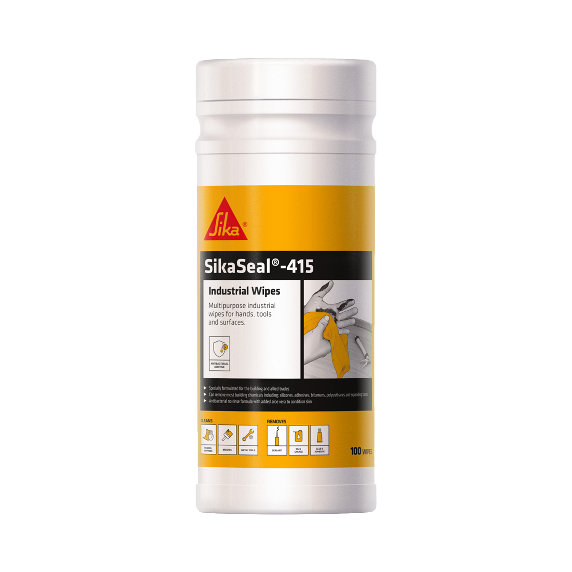 SikaSeal-415 Industrial Wipes are engineered for tackling tough substances like silicone, adhesives, expanding foams, oil, and grease. Ideal for hands, tools, and surfaces, these wipes feature a unique antibacterial, no-rinse formula enriched with aloe vera, leaving skin conditioned and smooth.